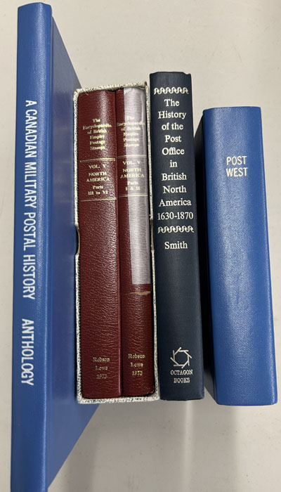 Group of 17 Various Canadian Philatelic Books, Post West (complete set bound together), the useful 2-volume Encyclopaedia of British Empire Postage Stamps (Vol. V, Robson Lowe, 1973), A Canadian Military Postal History Anthology (BNAPS, hardbound), the History of the Post Office in British North America 1630-1870 (Smith), an Eaton & Sons auction catalogue for Canadian Military Hong Kong POW mail (1980), 18th Century Maritime Influences on the History of Place Names of British Columbia and Writing by the Steamer (Parizeau), Canada Post postal information books from 1937, 1948, 1952 and 1956), the W.G. MacFarlane Picture Postcard Handbook 1902-1910 (Smith), The Canadian Picture Postcard Catalogue (Gutzman, 1985 and 1992), Canada Northern Russia Expeditionary Force 1918-1919 (Richardson), Notes on Oval Cancels of the Small Queen Era (Olson), Notes on the Postal History of Canada (Halliday), and others including a collection of 33 sepia RPPC from BC and a map of rural Vancouver post offices, see photos. (Image)