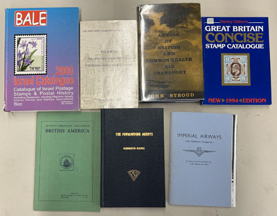 Group of 18 Various Worldwide Philatelic Books, Bale Israel Catalogue (2000), GB Concise Catalogue (1994), a Guide to 19th Century United States Postmarks and Cancellations (Gilman), Annals of British and Commonwealth Air Transport (Stroud), Postmarks of the United Kingdom (Kingston), British Empire Civil Censorship Devices of WWII British Asia (Morenweiser), Tin Can Mail (Clark), the 1935 California Pacific International Exposition (Neyhart), the 1915 Panama California Exposition (Neyhart), Pigeon and Balloon Post (photocopy), Prexie Postal History (Helbock), United States Postage Meter Stamp Catalog (Simon, Walsh, 1982), [American] International Machine Cancels 1888-1910 (Bond) and a few others (see photos). (Image)