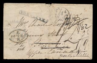 1840 (September 27), Great Britain to Toronto, redirected to Thornhill & York Mills, stampless folded letter, with partial cross-written contents, struck on reverse with Yarmouth North despatch, carried via the Halifax packet (Cunard Line) from Liverpool, with oval exit strike (28 Sep), circular "1s/4dcy" rate marking, alongside multiple manuscript accountant markings, received in Toronto (28 Oct), struck with boxed FORWARDED and redirected to Thornhill, with blue double-circle receiver backstamp (30 Oct), forwarded again with 14 November despatch strike on front and York Mills double-circle receiver backstamp of the same day, heavily vertical filing fold and other imperfections, but a most unusual York County cover. (Image)