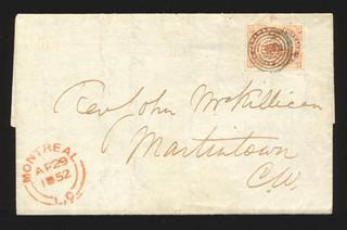 1852 (April 29), 3d red on laid paper, folded letter from Montreal to Martintown, adhesive with three large margins, just into frameline at top, tied by centrally-struck black target cancel, Montreal despatch strike at lower left, Lancaster (30 Apr) double split-ring transit backstamp, some light aging, else a fine; with 2006 Greene Foundation certificate. (Unitrade #1) (Image)