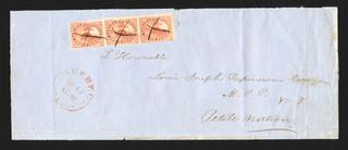 1852 (August 10), 3d red Beaver on wove paper, strip of three on cover to Louis Joseph Papineau, the strip cancelled in manuscript, one stroke tying it to cover, postmarked with Quebec double split-ring despatch strike at lower left, addressed to Papineau at Petite Nation (he resided in Montebello), with partial arrival backstamp, various filing folds and a couple small edge tears, one at top clear of adhesive, strip with small scissor cut between two stamps, but a scarce franking, one of only eight recorded 9d domestic triple rate covers franked with three 3d wove stamps recorded in the Wayne Smith Census, fine, offered with the booklet "Louis Joseph Papineau - A Divided Soul" by Fernand Ouellet and a small pamphlet on Le Manoir Papineau a Montebello. (Unitrade #4). (Image)