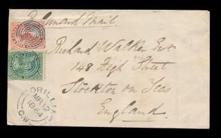 1864 (March 12), 17½c rate transatlantic cover from Orillia to England, franked with 5c vermilion and 12½c yellow green, each struck with seven-ring target cancel, Orillia double split-ring despatch strike below, endorsed in manuscript "P. Cunard Mail", reverse with Stockton-On-Tees c.d.s. receiver (29 Mar), light crease at upper left clear of adhesive, quite fresh and fine. (Sc. #15, 18) (Image)
