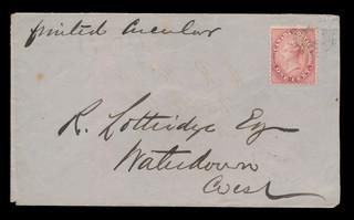 1864, 1c rose Decimal issue single franking on turned cover, adhesive to cover to Waterdown by black target cancel, endorsed "Printed Circular" in manuscript, turned and re-used to Mosa, handstamped PAID and 5 in black and struck with Waterdown double split-ring despatch (10 Mar), one side flap removed, else a fine and most unusual usage. (Sc. 14) (Image)