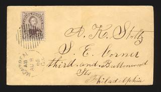 1865 (August 8), 10c violet Consort on cross-border cover from Montreal to Philadelphia, tied by neatly-struck Montreal duplex, without backstamps, quite fresh, a fine stamp and pretty cover. (Image)