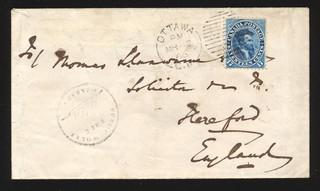 1866 (March 2), "Public Works / Canada / Free" on 17c blue Cartier cover, to Hereford, England, adhesive tied by Ottawa duplex, carried via New York by the steamer "Cuba" of the Cunard Line, arriving on March 18, with next-day Hereford c.d.s. arrival backstamp, tear through flap, sender's notation under flap, some light soiling in places, but a rare cover, this circular Public Works handstamp unrecorded by Davis in "An Overview of the Canadian Government Official Handstruck Postal Markings”, where it is noted that "all known Public Works handstamps are hexagonal shaped," not the case in this instance, fine-very fine. (Sc. #19) (Image)