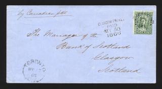 1866 (May 17), 12½c yellow green on transatlantic cover to Scotland, tied by Toronto square grid cancel, split-ring despatch strike at lower left, endorsed "by Canadian pkt" and struck "GLASGOW PACKET / PAID / MY 30 / 1866", no backstamps, a fresh and fine example of the 12½c packet rate. (Image)