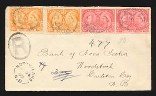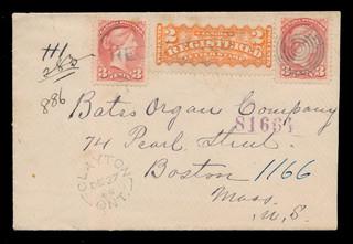1888 (December 27), 3c rose carmine Small Queen registered cover to the United States, two singles, placed on either side of 2c orange Registered Letter Stamp, tied to each other by 7-ring target and Registered straight-line cancels, paying the 3c US letter rate plus 5c registration fee from Clayton, Ontario to Boston, Massachusetts, with purple oval receiver (31 Dec), and with Almonte (28 Dec), Ottawa (28 Dec) and Montreal (29 Dec) transit backstamps, attractive and very fine; at that time, the use of the 5c RLS to pay the registration fee was still required and this cover is a lovely exception to this rule. (Sc. 41a, F1) (Image)