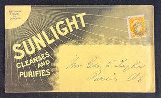 1892 Sunlight Soap illustrated advertising cover with contents, franked with a 1c Small Queen and sent from Toronto to Paris, Ontario, featuring an ornate printed advertisement for Sunlight Soap, a highly attractive and well-preserved example of Victorian advertising mail, very fine. (Image)
