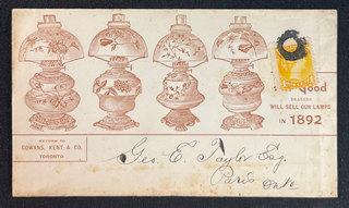 1892 Gowan, Kent & Co. Lamps illustrated advertising cover with contents, franked with a 1c Small Queen, sent from Toronto to Paris, Ontario, with enclosure depicting the London Exhibition and promoting the company’s line of lamps, some toning at bottom, else visually appealing and very fine. (Image)