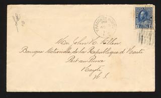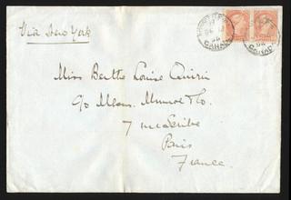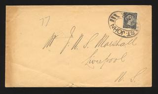 1892, ½c black Small Queen, single- franking on addressed unsealed cover, stamp tied by very fine St. John oval parcel cancel, sent unsealed, contrary to regulations for use of the ½c, reverse with Liverpool c.d.s. arrival backstamp (3 Dec), toned at left with some creasing, an uncommon franking. (Sc. 34) (Image)