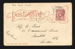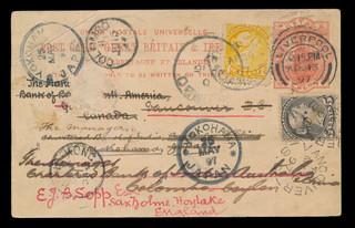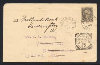 1892/1897, two redirected 5c rate Small Queen covers to London, England, one franked with single 5c, tied by Victoria c.d.s. (10 Jun), redirected from Lombard Street in London to Kensington, with superbly-struck "Lombard St. B.O. / E.C." squared circle on front (27 Jun), the second franked with 2c and 3c singles, tied by Montreal flag cancel (Indicia F) (3 Jun), endorsed "via New York", redirected from Abchurch Lane in London to the Isle of Wight, with "Lombart St." squared circle on front (12 Jun), reverse with crisp next-day Ryde c.d.s. receiver, an attractive pair. (Image)