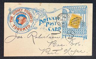 1895 Gurney Foundry illustrated advertising private post card, franked with a 1c Small Queen, with radiator-design stamp collar, sent from Peter Street, Toronto to Port Hope, with detailed illustrated advertising for Gurney Foundry, a few small spots at top, else striking and very fine. (Image)