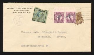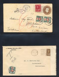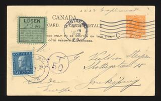 1923 (December 14), 1c Admiral postage due stationery card to Sweden, postmarked Montreal, to Jönköping, shortpaid and affixed with 30o Swedish postage due adhesive, paid by 30o blue King Gustav coil, tied by Jönköping c.d.s., attractive and fine-very fine. (Image)