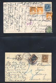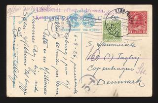 1926 (June 10), shortpaid 3c Admiral postcard to Denmark, postmarked Toronto, to Copenhagen, underpaid, struck T/10 and affixed with 10o Danish postage due, tied by Copenhagen c.d.s., addressee unknown and struck with corresponding Danish two-line violet handstamp at top, some light edge wear, scarce. (Image)