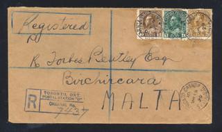 1921/29, two registered Admiral covers to Malta, one franked with 3c brown and 10c plum, tied by Vancouver c.d.s. (24 Jan, 1921), to Valletta, paying the 3c first class Empire rate and 10c registration fee, the second cover franked with 1c dark green coil, 3c brown, and 10s bistre, all tied by Toronto Station G c.d.s. (19 March, 1929), paying the double UPU registered letter rate, a fine-very fine and scarce duo. (Image)