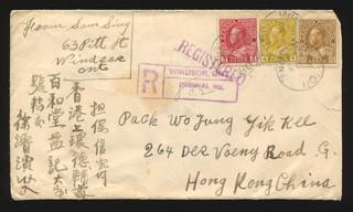 1925 (December 15), registered Admiral cover to Hong Kong, franked with 3c, 4c, and 10c singles, the 4c paying the First Class Empire rate, the 3c paying the additional ounce, and the 10c the registration fee, all tied by Windsor c.d.s., struck with violet REGISTERED and R/WINDSOR, ONT handstamps, reverse with Windsor (15 Dec) and Chicago (16 Dec) backstamps, slightly reduced at right and a few small spots of soiling, an uncommon destination. (Image)
