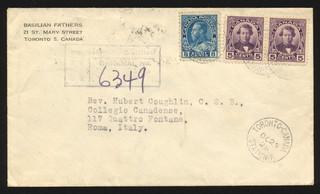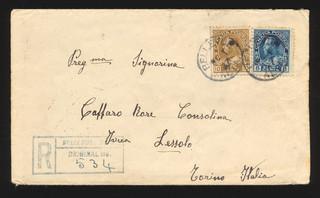 1927 (February 1), Bellevue, Alberta to Italy, registered Admiral cover, franked with single 8c and 10c, paying the registered first class rate effective October 1, 1925, tied by Bellevue c.d.s., reverse with multiple backstamps including Montreal (5 Feb), Torino (21/22 Feb), and Lessolo (22 Feb), a few small imperfections, else fine-very fine. (Image)