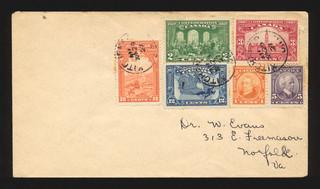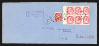 1931 (February 9), 2c Numeral booklet pane on registered cover to the United States, used in combination with single 2c Arch, all cancelled by Toronto c.d.s., paying the double registered letter rate, reverse with next-day c.d.s. arrival backstamps, an incredibly unusual philatelic usage, with even off-cover used plate blocks of this issue being quite elusive, very fine. (Scott #77b, 165) (Image)