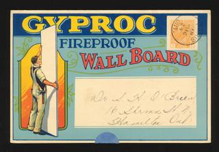 1929, Gryproc Fireproof Wall Board, full-colour 1c Admiral private postal stationery card, postmarked with Paris c.d.s., to Hamilton, with attached ½c reply card with pre-printed address of Canada Gypsum and Alabastine Limited, both cards fully-illustrated with a variety of home and building scenes, promising that Gyproc "keeps your home cool in the summer and warm in the winter," scene of a home fire on reverse with the text "Why build to burn?", a superb and scarce card of exceptional quality, very fine. (Image)