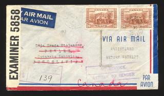 1941 (Jan 21), Hamilton to Yugoslavia, registered A/R cover, returned service suspended, franked with two 20c Fort Garry Gate, tied by Hamilton c.d.s., endorsed "REGISTERED" and "RETURN RECEIPT", to Perlez, Yugoslavia (today Serbia), address crossed-out and handstamped with violet framed "NO SERVICE / RETURN TO SENDER", backstamped Hamilton (21 Jan), Ottawa (22 Jan), Vancouver (23 Jan), and Montreal (3 Sep), scarce and very fine. (Image)