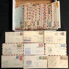 Group of more than 125 mostly First Flight covers, 1928 to 1930s, with strong representation of cross-Canada and Canada–USA flights, mostly common routes but ideal as a foundation for a new collection in this popular area of postal history, with many handstamped cachets showing good strikes; also includes several modern First Day Covers and a set of George VI "no Postes-Postage" blocks of four, postmarked one week after issue with “First day use in Grimsby” annotation, overall fine or better. (Image)