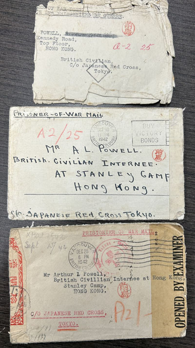 Correspondence of a World War II Hong Kong Prisoner of War, starts with a POW card sent from the prisoner Lawrence Arthur Powell (in Camp Stanley) to his wife in Vancouver BC on FEB.25.1944, with censored text, etc. (comes with a second unused card). Also includes six covers mailed to the same prisoner of war in Hong Kong from his daughter and wife in Vancouver BC or England, dated in the range of OCT.6.1942 to MAY.30.1944. One of these has a scarce Kuper Island BC datestamp, and all have various censor handstamps or labels, etc. Most of the covers are damaged with wear, some are open on three sides for display, etc., still a useful lot for postmarks, chops, routings (Red Cross in Tokyo, one went through Germany), etc. Mr. Powell was a British civilian POW who was a senior revenue officer in Hong Kong. (Image)