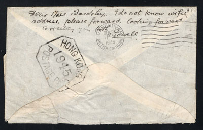 1943 Hong Kong Postage Paid Cover to Canada, Forwarded to England, mailed (with the scarce POSTAGE PAID octagonal handstamp on back) by Arthur Lawrence Powell who had just been a POW at Camp Stanley in Hong Kong to someone working at a Vancouver BC high school (received there on SEP.28.1945), asking her to forward the cover to his wife, who had since moved to England. She then franked it with a 10c and 20c stamp paying the airmail rate to England and it was forwarded on SEP.29.1945. This franking handstamp was used in the short period after HK had resumed mail services on AUG.25.1945 and SEP.25.1945 when postage stamp use resumed. It was mainly reserved for the use of Stanley internment camp prisoners and military personnel. From the same correspondence as the previous lot. (Image)
