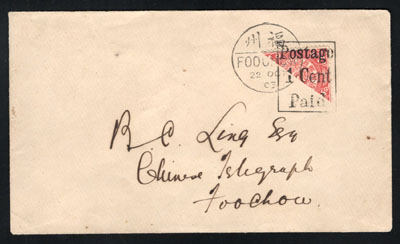 1903 Bisected 2c Issue on Cover from Foochow, mailed on the first day of this usage (OCT.22.1903) to a local address in Foochow, with Scott #123 properly tied by c.d.s. and boxed "Postage 1 Cent Paid" handstamp. Back has no receiver (catalogued as such) but we note a small red expert handstamp. Very fine. (Image)
