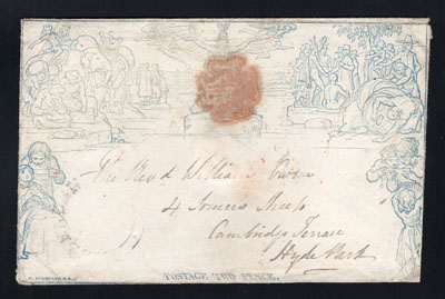 1840 2d Blue Mulready Envelope, mailed on DEC.12.1840 to Cambridge Terrace near London, with a red Maltese Cross and a same day receiver in red on back, plus an indistinct (...SENDEN) town postmark on front. Stereo "a208", showing light overall aging, still scarce and fine. S.G. ME4, £2,500. (Image)