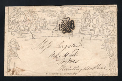 1840 1d Black Mulready Envelope, mailed from Cambridge on APR.3.1841 to St Ives, with a black Maltese Cross and a next day receiver in red on back. Stereo "A136" (Forme 1), showing light overall aging, still fine. S.G. ME3, £550. (Image)