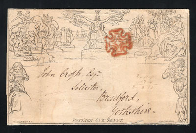 1840 1d Black Mulready Letter Sheet, mailed on JUN.6.1840 to Bradford (there is a "JUN.3.1840" docketing inside), with a red Maltese Cross almost missing Britannia. Stereo "A1" (Forme 1), showing a few light creases and overall aging, still fine. S.G. ME1, £550. (Image)