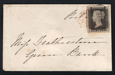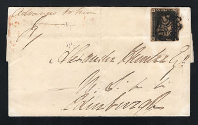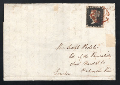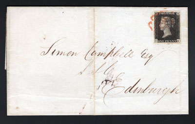 1d Black Queen Victoria Imperforate on 1840 Folded Letter, mailed from Glasgow on MAY.19.1840 (red despatch on back) to Edinburgh (indistinct receiver on back), franked with a 4 close to well clear margin 1d black QV imperforate (pos. RL, pencil notation "Pl.1a"), tied by a Maltese Cross cancel in red. Overall fine. (Image)