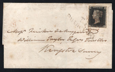 1d Black Queen Victoria Imperforate on 1841 Folded Cover, mailed from Putney on FEB.9.1841 (red despatch on back, docketing inside and black straightline on front) to Kingston, franked with a 3-margin 1d black QV imperforate (pos. JJ, showing part of the next stamp at right, plus plate scratches in upper margin), tied by an light Maltese Cross cancel in red plus part of the straightline cancel. Red wax seal, with light overall soiling, fine. (Image)