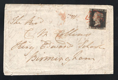1d Black Queen Victoria Imperforate on 1840 Folded Letter, mailed from St Columb on DEC.2.1840 (green despatch on back) to Birmingham (DEC.4.1840 receiver in red on back), franked with a 4-margin 1d black QV imperforate (pos. TD), tied by a Maltese Cross cancel in bright red. Overall fine. (Image)
