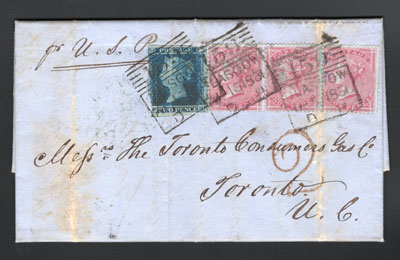 Glasgow Experimental Duplex Cancellation on Folded Letter Mailed to Canada, mailed Glasgow on APR.15.1856 (with three strikes of the so-called Madelaine Smith cancel) to Toronto, Upper Canada (faint receiver on back) through Liverpool (APR.16 transit in green on back), endorsed "Per U.S. Packet". The folded letter is franked with a pair plus single of Scott #22 ($900 on cover) plus a Scott #4 ($400 on cover) paying a 13d rate. The inside is a two-page invoice from the Toronto Gas Consumer's Company (Glasgow office). Vertical creases, one through 2d blue and one just in-between two of the 4d rose stamps, else very fine and scarce. (Image)