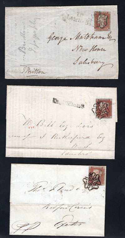 Group of 6 Penny Red Covers with Numbered Maltese Cross Cancels, with #s 6 (F, on cover to Paisley, with crease through stamp), 6 (F, on cover to Salisbury), 7 (VF on cover to Exeter), 8 (F, on local printed matter cover), 9 (F-VF on cover to Edinburgh), and 11 (F-VF on cover to Edinburgh). Both sides photographed to see back stamps, overall fine. Scott catalogue value is U$3,625. (Image)