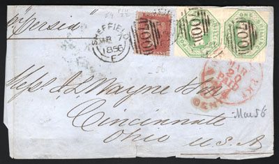 Pair of 1sh QV Embossed on Cover to United States, mailed from Sheffield on MR.7.1856 (three duplex #700 strikes) to Cincinnati, Ohio, through Liverpool (MAR.8.1856 transit in green), endorsed "per Persia", with US packet MAR.20 receiver and "5 CENTS" handstamp. The folded cover is franked with a perforated Penny Red plus a very fine horizontal pair of the embossed 1sh green imperforates (Die 2), which each have 4 clear margins. The cover (no letter inside) has been reduced , still a scarce franking and lovely pair of the 1sh. Catalogue value for two 1sh singles is U$2,000 in Scott and £2,200 in S.G. alone. (Image)