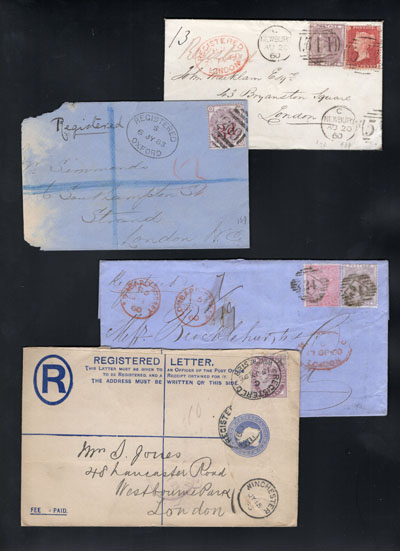 Group of 16 Queen Victoria Registered Covers and Stationery, 10 of which are registered stationery envelopes with a variety of frankings and destinations (3 to Germany, one to Russia franked with perfined stamp, one to Norway and rest are domestic). Also 6 other covers with a variety of frankings and destinations such as United States, Germany and domestic. Of the frankings, we noted a Scott #7 (cut close), 22, 27, 94 (fine stamp on a faulty cover) and more. An interesting and useful group, overall fine or better. (Image)