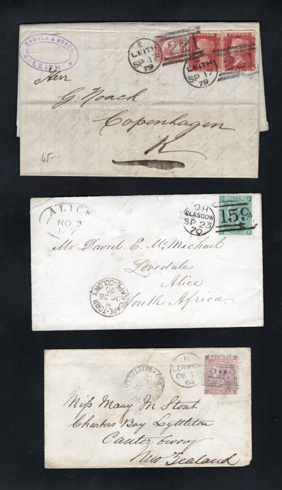 Group of 9 Queen Victoria-Franked Covers Mailed from Scotland to Foreign Destinations, 1864 to 1886, including 1864 6d to New Zealand, 1865 8d to France, 1870 1sh to South Africa, 1871 4d to France, 1875 1sh to Trinidad, 1879 2½d to Denmark (two), 1880 2½d to Italy, and 1886 4d to Germany. Good variety of Scottish postmarks and frankings, overall fine or better. (Image)
