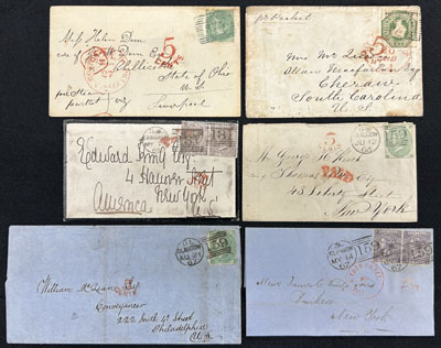 Group of 19 Queen Victoria-Franked Covers Mailed from England to the United States, 1858 to 1894, noting a variety of postmarks, rates and frankings, including a lovely 1858 folded letter franked 1sh, an 1873 folded letter franked with Scott 59b (plate 12, U$725 on cover), an 1887 2½d franked cover with 10c Postage Due stamp on arrival, and other interesting items. Couple of opening faults, etc. still overall fine or better. (Image)