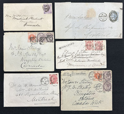 Group of 17 Queen Victoria-Franked Covers Mailed from England to Canada, 1864 to 1899, noting a variety of postmarks, rates and frankings, including an 1864 1sh rate, 1870 3d rate, two 1870 6d rates, three 1879 and 1880 2½d rates, 1899 1d rate and more, including a correspondence to the same person in Kingston and Toronto. Couple of opening faults, one cover missing one stamp, etc. still overall fine. (Image)