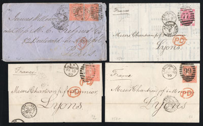 Group of 16 Queen Victoria-Franked Covers Mailed from England to France, 1858 to 1880, noting a variety of postmarks (incl. despatch, transit and receivers), rates and frankings, including 6 covers franked with Scott # 49 (one plate 5, rest plate 6), two covers franked with #26, (a single and a pair), a #68 (plate 18) on cover, two covers franked with #34 (U$345 each), 5 covers franked with #43 (plates 7, 9, 10, 11). An overall fine or better group. (Image)