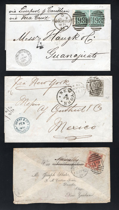 Group of 6 Queen Victoria-Franked Covers Mailed from England to Foreign Destinations, 1866 to 1884, with 1884 5d cover to China (#85, U$375 on cover), 1869 10d cover to New Zealand (#53, U$975 on cover), 1866 10d cover to Australia, 1884 8d folded letter to Mexico (pair of #84, plate 18), 1877 6d (plate 15) folded cover to Mexico, 1871 2sh (pair of #48, plate 4) on folded letter to Mexico. A few faults here and there, still a fine or better group. (Image)
