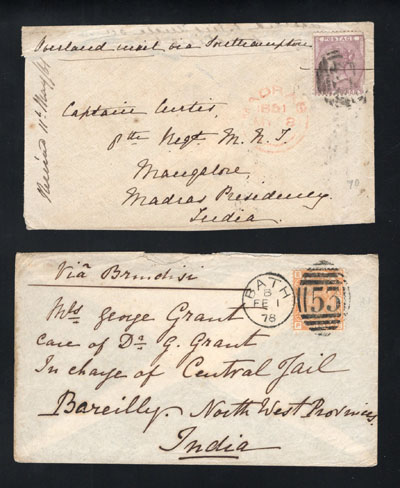 Group of 4 Queen Victoria-Franked Covers Mailed to India, 1861 to 1883, with 1861 6d (Scott #27) to a Captain in the 8th Regiment in Madras (via Southampton), 1878 8d (Scott 73) to a person "In charge of Central Jail" in Bareilly in the North West Provinces (via Brindisi), and two similar covers (1882-83) 10d (pair of #85) to a Lt. Col. in the Royal Artillery in Punjab, both forwarded. All have opening faults at top, else fine or better. (Image)