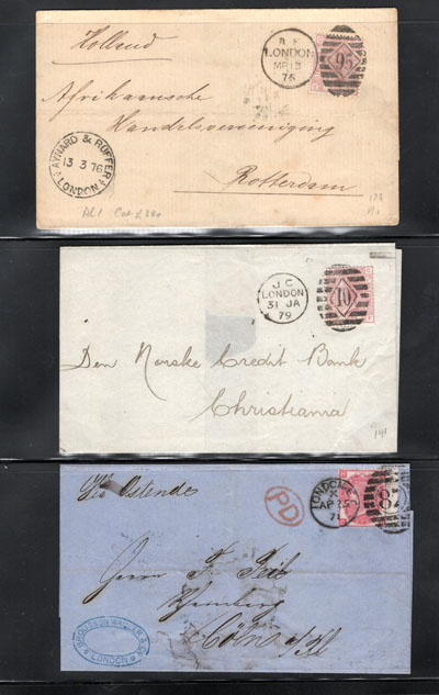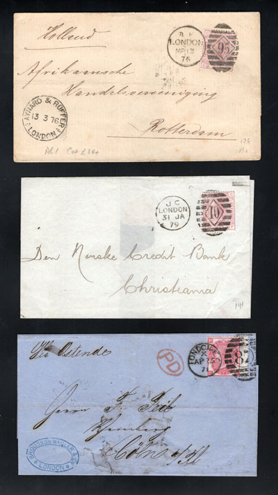 Group of 11 Queen Victoria-Franked Covers Mailed to European Destinations, 1863 to 1891, 1876 2½d folded cover to Holland, 1866 3d (Scott #44, plate 4) cover to Holland, 1879 2½d (#67) folded cover to Denmark, 1879 2½d (2x 1d and ½d plate 15) cover to Denmark, 1887 2½d (#101) folded letter to Spain, 1871 3d (#49a, plate 6) folded cover to Germany, 1878 2½d (#67, plate 9) on cover to Germany, 1891 2½d embossed stationery cover to Germany, 1868 9d (2x 4d #43 and 1d) folded cover to Russia, 1863 6d (#39) cover to Switzerland (insufficiently prepaid, via Calais) and 1866 5d (1d and 4d) cover to Switzerland. A few with faults, else overall fine or better. (Image)