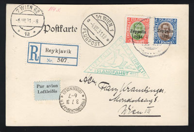 1931 (July) Iceland Zeppelin Flight Registered Postcard, franked with 30a and 1k “ZEPPELIN / 1931” overprinted stamps, tied by an indistinct c.d.s. on a real photo card to Vienna, Austria with JUL.4.1931 and JUL.6.1931 c.d.s. free strikes. There is also a green triangular flight cachet and a Friedrichshafen c.d.s. dated JUL.3.1931. The photo is captioned “Trip to Austria MAY.2.1929" and shows an aerial view. A very fine and lovely card, and the stamps alone catalogue $280 as used. (Image)