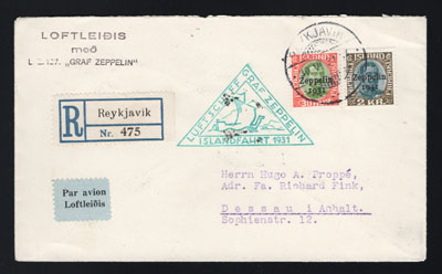 1931 (July) Iceland Zeppelin Flight Registered Cover, franked with 30a and 2k “ZEPPELIN / 1931” overprinted stamps, tied by a Reykjavik JUN.30.1931 c.d.s., with the triangular green flight cachet on front. Cover is addressed to Dessau, Germany, with a JUL.4.1931 receiver, plus a Friedrichshafen c.d.s. dated JUL.3.1931. Very fine, and the stamps alone catalogue $320 as used. Est 100 C9, C11 (Image)
