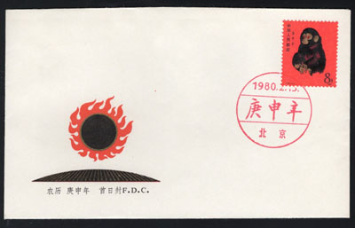 1980 8f New Year Monkey First Day Cover, a very fine stamp tied by a red FEB.15.1980 c.d.s., with cachet, very fine and rare. Scott catalogue value for the used stamp alone is U$675. (Image)