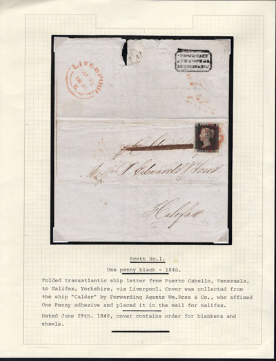 1840 (Aug.12) Penny Black Folded Letter Mailed from Venezuela to England, mailed from Puerto Cabello, Venezuela on JUN.29.1840 (dateline inside) to Halifax, England and arrived in Liverpool on AUG.12.1840 (receiver in red) where it was taken over by a forwarding agent (boxed "FORWARDED BY / WM. ROSS & CO. / LIVERPOOL"), who added a 4-margin (close, to clear on one side) 1p black Queen Victoria imperforate adhesive (Plate 1b, position NH) tied by a red Maltese Cross cancel (same colour as the Liverpool receiver). A rare and desirable use of the Penny Black, in fact we have not found any similar examples except for one incoming from India which received similar treatment and was described at auction as one of three known (from India) and sold for U$9,300. This was the pride and joy of the owner, as it was given to him by a neighbour when he was a child. The neighbour had a family connection to the senders in Venezuela, and this is the first time it appears on the market. (Image)