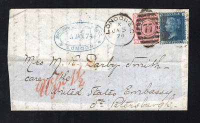 1874 Folded Cover Great Britain to Russia, mailed from the Brown Shipley & Co. in London on JAN.5.1874 ("77" duplex ties stamps) to the United States Embassy in St. Petersburg, Russia, with JAN.28.1873 (error in year) receiver on back. The folded cover (missing large part of the letter) is franked with Scott #s 30 (plate 14, $80 on cover) and 61 (plate 12, $140 on cover) paying 5d. There is a red-orange "W fr 1½" German handstamp at left indicating postage due on arrival. A fine cover. (Image)